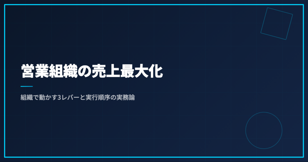 営業組織の売上最大化は、集客を増やす前に、既存組織が動かせる3レバー(顧客セグメント配分・商談ステージ別の詰まり解消・マネジメント稼働率)を順序立てて最適化するのが短期で効く打ち手です。施策を足す前に、既存の型とKPIをどこまで使い切れているかを見る視点が重要です。