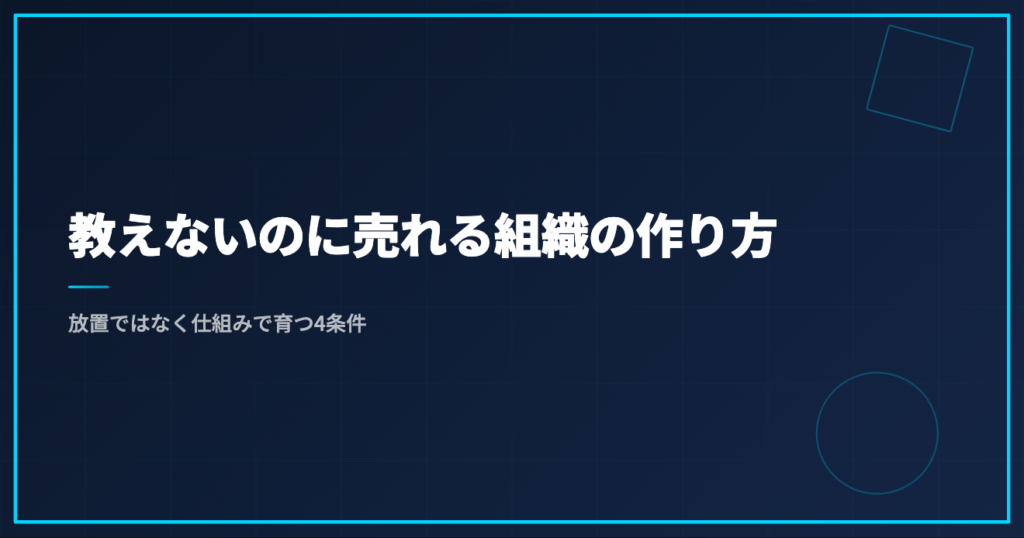 「教えないのに売れる組織」は、マネージャーの指導量を減らしても売上が伸びる状態を指し、放置とは逆に、売れる型とメトリクスで動く仕組みを組織側が整えた結果として成立するものに他なりません。主語は指導スキルではなく、組織側の前提条件です。